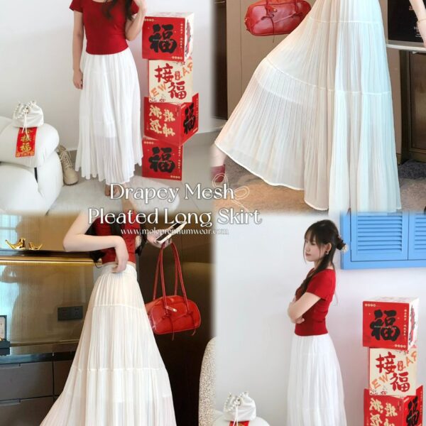 Drapey Mesh Pleated Long Skirt