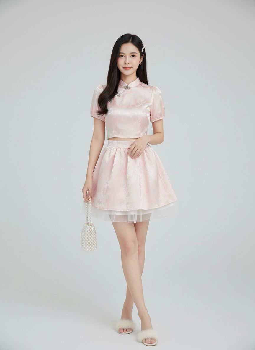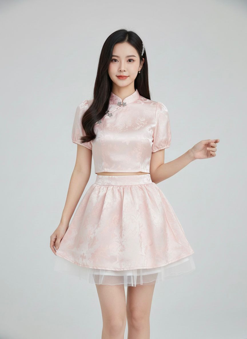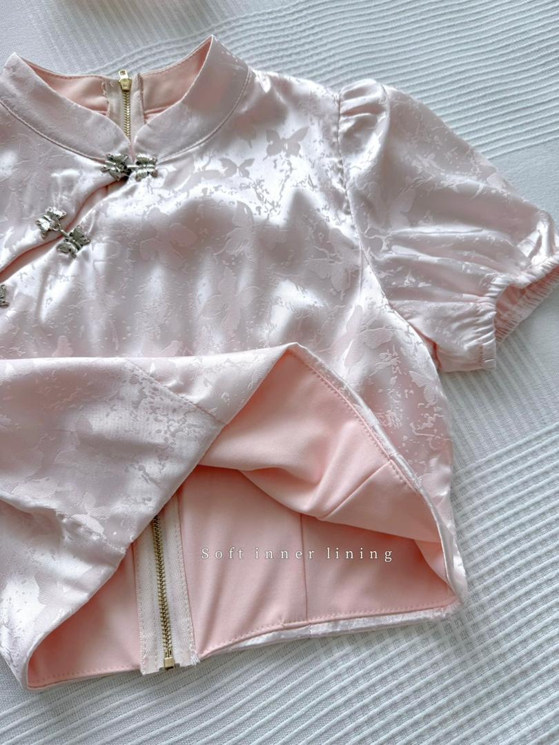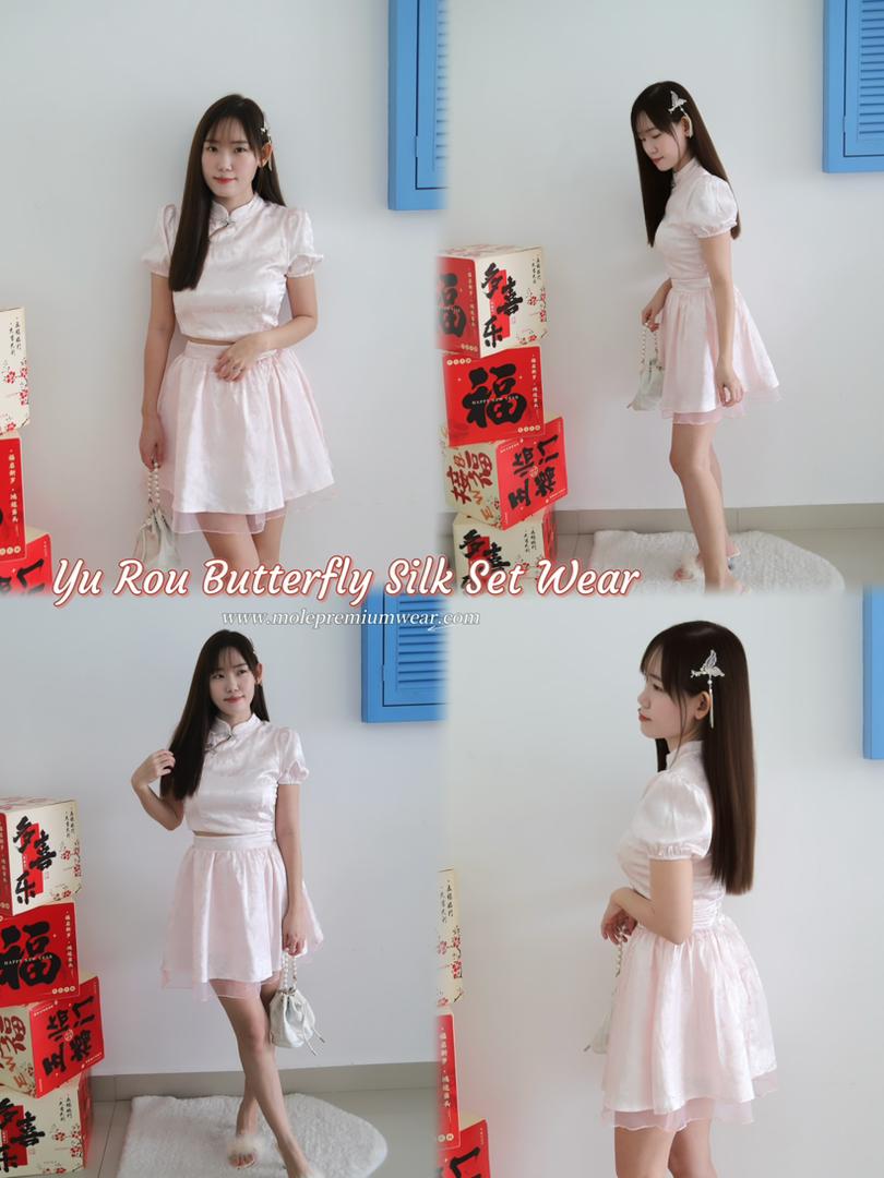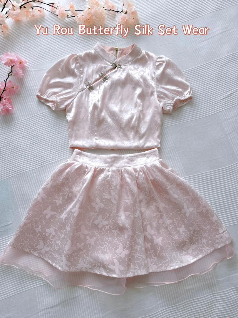 𝘈 𝘮𝘰𝘥𝘦𝘳𝘯 𝘵𝘸𝘰-𝘱𝘪𝘦𝘤𝘦 𝘳𝘦𝘪𝘯𝘵𝘦𝘳𝘱𝘳𝘦𝘵𝘢𝘵𝘪𝘰𝘯 𝘰𝘧 𝘵𝘩𝘦 𝘤𝘭𝘢𝘴𝘴𝘪𝘤 𝘤𝘩𝘦𝘰𝘯𝘨𝘴𝘢𝘮, 𝘵𝘩𝘦 𝘠𝘶 𝘙𝘰𝘶 𝘉𝘶𝘵𝘵𝘦𝘳𝘧𝘭𝘺 𝘚𝘪𝘭𝘬 𝘚𝘦𝘵 𝘧𝘦𝘢𝘵𝘶𝘳𝘦𝘴 𝘢 𝘮𝘢𝘯𝘥𝘢𝘳𝘪𝘯-𝘤𝘰𝘭𝘭𝘢𝘳 𝘤𝘳𝘰𝘱 𝘵𝘰𝘱 𝘱𝘢𝘪𝘳𝘦𝘥 𝘸𝘪𝘵𝘩 𝘢 𝘩𝘪𝘨𝘩-𝘸𝘢𝘪𝘴𝘵𝘦𝘥 𝘧𝘭𝘢𝘳𝘦𝘥 𝘴𝘬𝘪𝘳𝘵, 𝘧𝘪𝘯𝘪𝘴𝘩𝘦𝘥 𝘸𝘪𝘵𝘩 𝘢 𝘥𝘳𝘦𝘢𝘮𝘺 𝘵𝘶𝘭𝘭𝘦 𝘩𝘦𝘮. 𝘊𝘳𝘢𝘧𝘵𝘦𝘥 𝘧𝘳𝘰𝘮 𝘴𝘰𝘧𝘵 𝘭𝘪𝘨𝘩𝘵-𝘱𝘪𝘯𝘬 𝘴𝘪𝘭𝘬 𝘴𝘢𝘵𝘪𝘯✨, 𝘪𝘵 𝘪𝘴 𝘢𝘥𝘰𝘳𝘯𝘦𝘥 𝘸𝘪𝘵𝘩 𝘢 𝘥𝘦𝘭𝘪𝘤𝘢𝘵𝘦 𝘣𝘶𝘵𝘵𝘦𝘳𝘧𝘭𝘺 𝘫𝘢𝘤𝘲𝘶𝘢𝘳𝘥 𝘱𝘢𝘵𝘵𝘦𝘳𝘯 𝘢𝘯𝘥 𝘦𝘭𝘦𝘨𝘢𝘯𝘵 𝘫𝘦𝘸𝘦𝘭-𝘦𝘯𝘤𝘳𝘶𝘴𝘵𝘦𝘥 𝘧𝘳𝘰𝘨 𝘣𝘶𝘵𝘵𝘰𝘯𝘴.💕