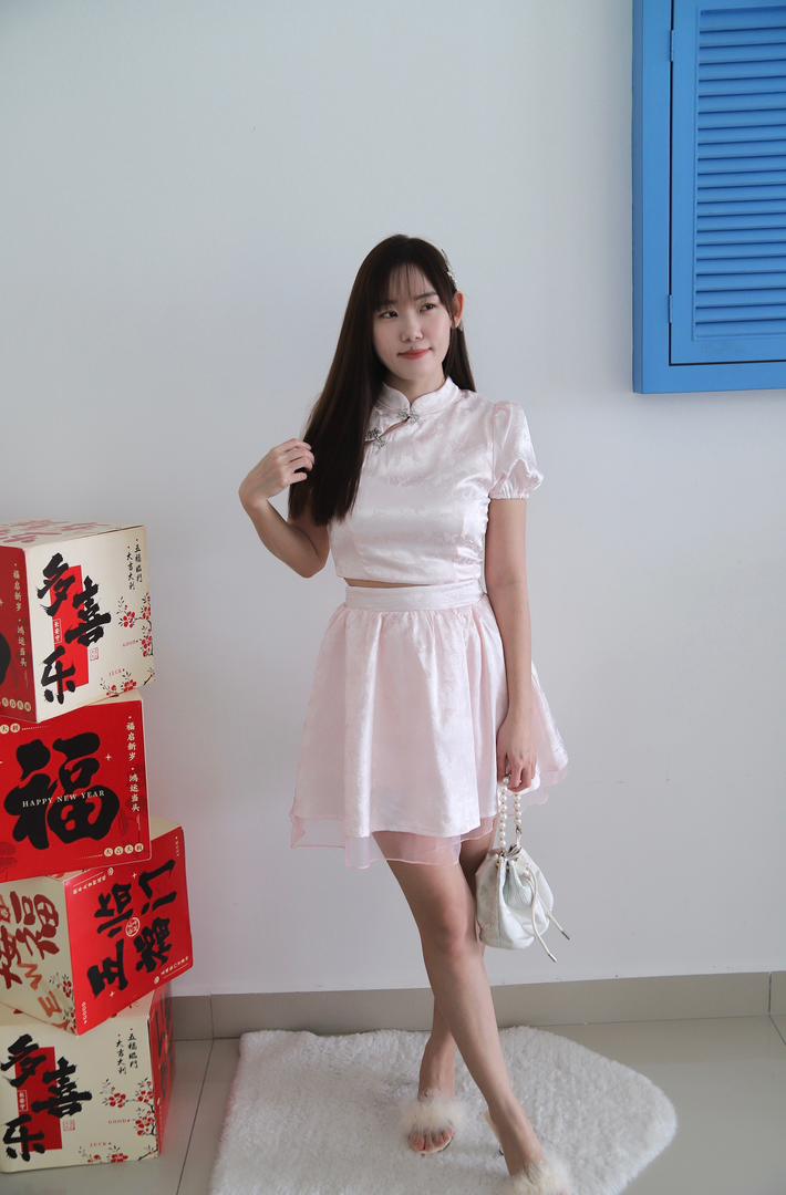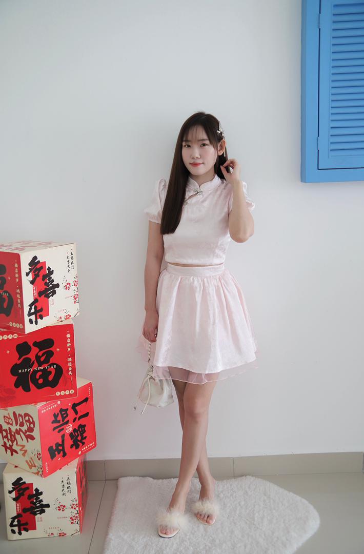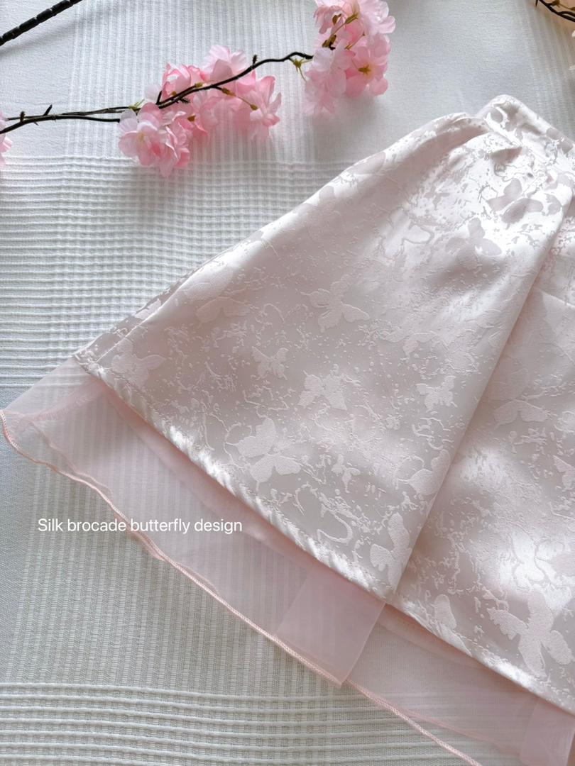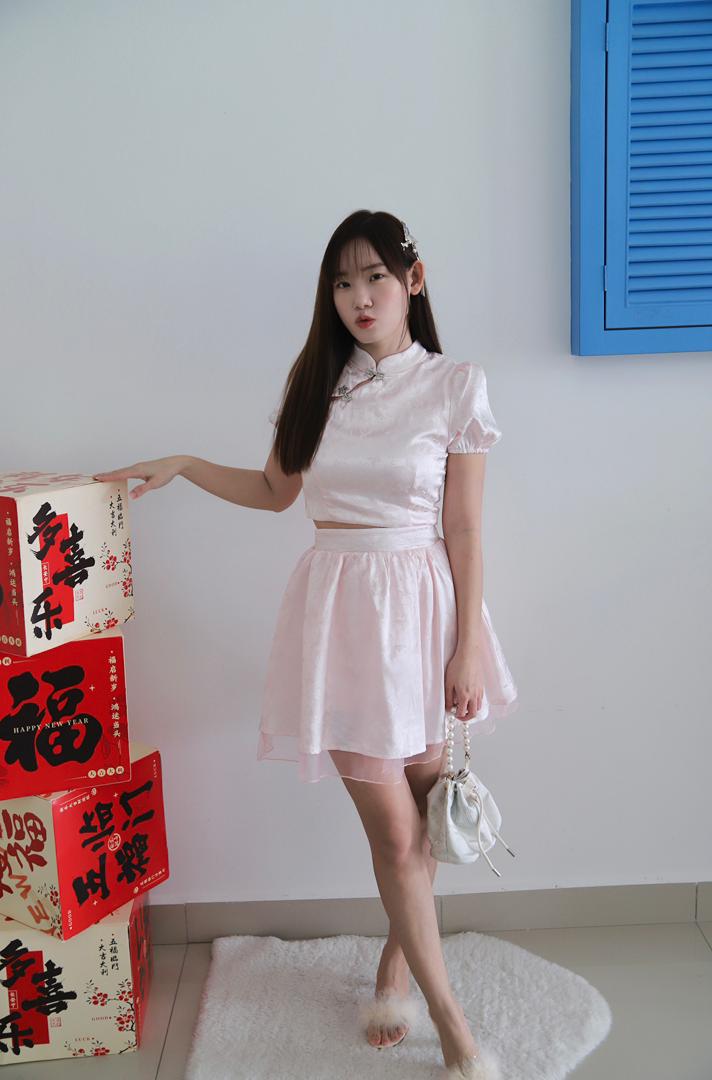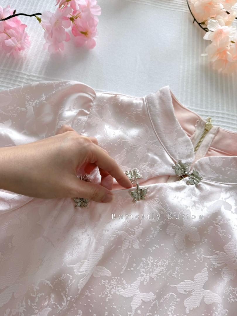 𝘈 𝘮𝘰𝘥𝘦𝘳𝘯 𝘵𝘸𝘰-𝘱𝘪𝘦𝘤𝘦 𝘳𝘦𝘪𝘯𝘵𝘦𝘳𝘱𝘳𝘦𝘵𝘢𝘵𝘪𝘰𝘯 𝘰𝘧 𝘵𝘩𝘦 𝘤𝘭𝘢𝘴𝘴𝘪𝘤 𝘤𝘩𝘦𝘰𝘯𝘨𝘴𝘢𝘮, 𝘵𝘩𝘦 𝘠𝘶 𝘙𝘰𝘶 𝘉𝘶𝘵𝘵𝘦𝘳𝘧𝘭𝘺 𝘚𝘪𝘭𝘬 𝘚𝘦𝘵 𝘧𝘦𝘢𝘵𝘶𝘳𝘦𝘴 𝘢 𝘮𝘢𝘯𝘥𝘢𝘳𝘪𝘯-𝘤𝘰𝘭𝘭𝘢𝘳 𝘤𝘳𝘰𝘱 𝘵𝘰𝘱 𝘱𝘢𝘪𝘳𝘦𝘥 𝘸𝘪𝘵𝘩 𝘢 𝘩𝘪𝘨𝘩-𝘸𝘢𝘪𝘴𝘵𝘦𝘥 𝘧𝘭𝘢𝘳𝘦𝘥 𝘴𝘬𝘪𝘳𝘵, 𝘧𝘪𝘯𝘪𝘴𝘩𝘦𝘥 𝘸𝘪𝘵𝘩 𝘢 𝘥𝘳𝘦𝘢𝘮𝘺 𝘵𝘶𝘭𝘭𝘦 𝘩𝘦𝘮. 𝘊𝘳𝘢𝘧𝘵𝘦𝘥 𝘧𝘳𝘰𝘮 𝘴𝘰𝘧𝘵 𝘭𝘪𝘨𝘩𝘵-𝘱𝘪𝘯𝘬 𝘴𝘪𝘭𝘬 𝘴𝘢𝘵𝘪𝘯✨, 𝘪𝘵 𝘪𝘴 𝘢𝘥𝘰𝘳𝘯𝘦𝘥 𝘸𝘪𝘵𝘩 𝘢 𝘥𝘦𝘭𝘪𝘤𝘢𝘵𝘦 𝘣𝘶𝘵𝘵𝘦𝘳𝘧𝘭𝘺 𝘫𝘢𝘤𝘲𝘶𝘢𝘳𝘥 𝘱𝘢𝘵𝘵𝘦𝘳𝘯 𝘢𝘯𝘥 𝘦𝘭𝘦𝘨𝘢𝘯𝘵 𝘫𝘦𝘸𝘦𝘭-𝘦𝘯𝘤𝘳𝘶𝘴𝘵𝘦𝘥 𝘧𝘳𝘰𝘨 𝘣𝘶𝘵𝘵𝘰𝘯𝘴.💕
