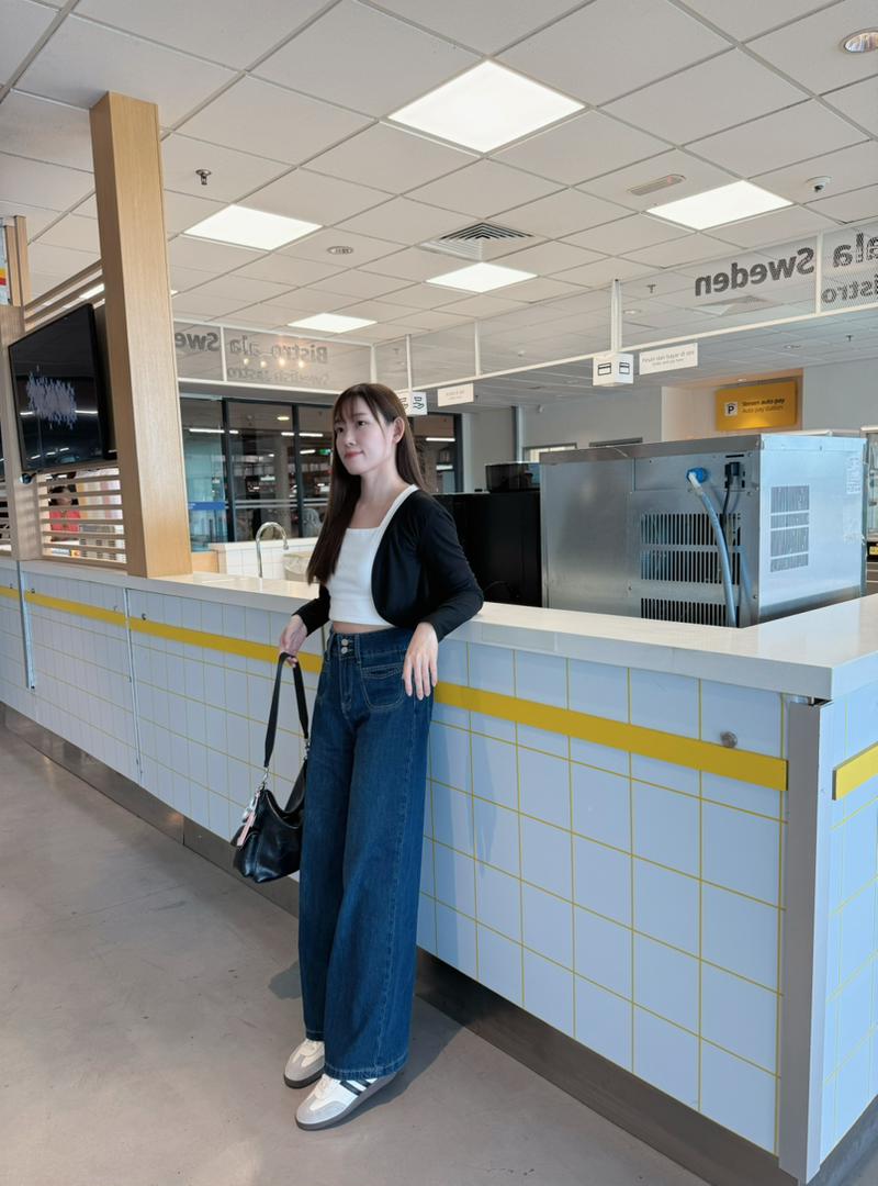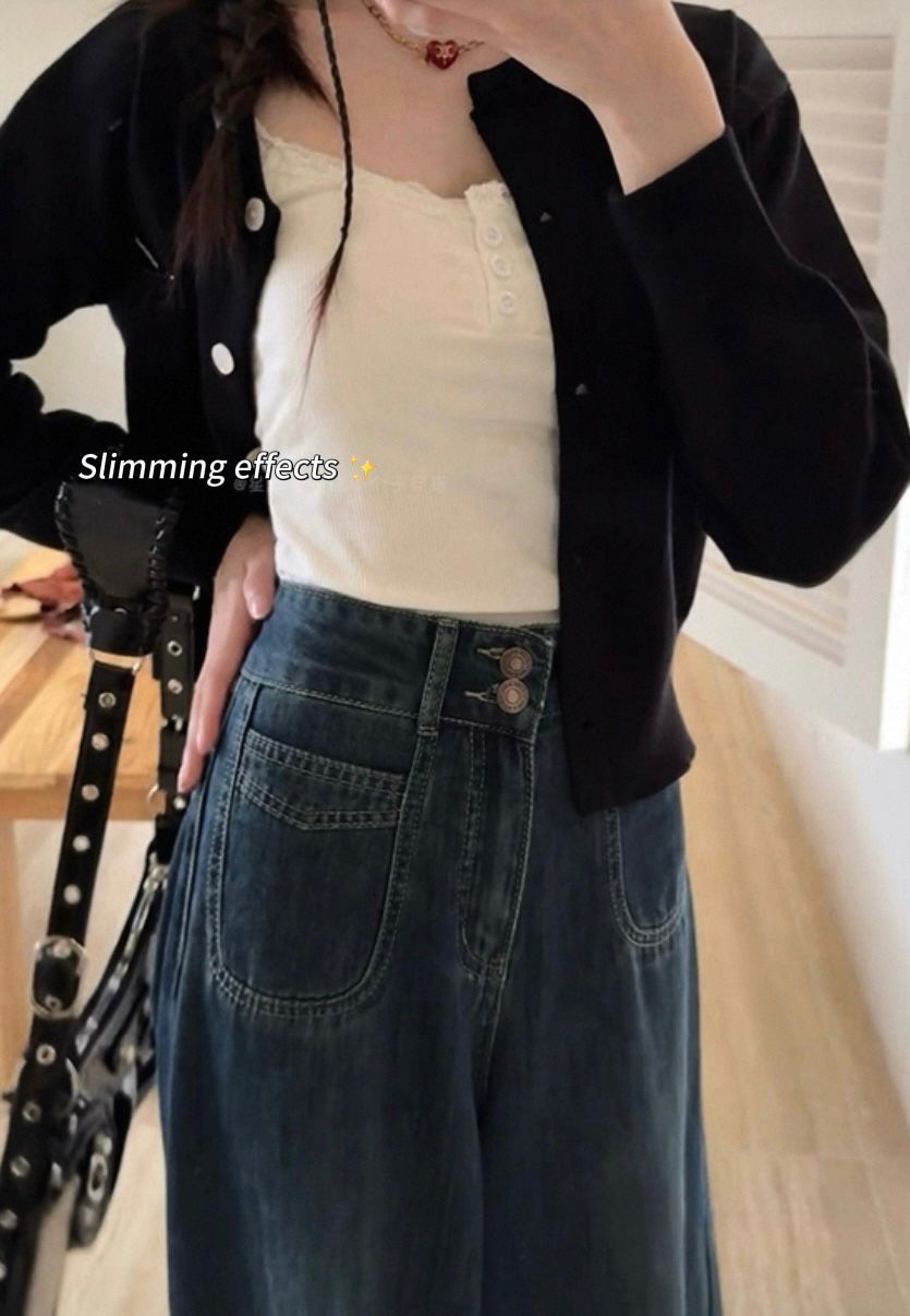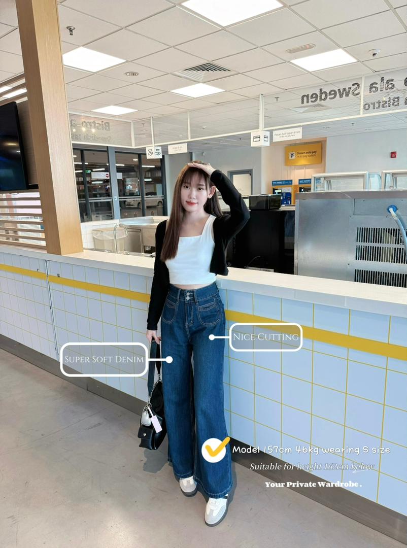 𝘋𝘢𝘳𝘬 𝘣𝘭𝘶𝘦 𝘳𝘦𝘵𝘳𝘰 𝘸𝘪𝘥𝘦-𝘭𝘦𝘨 𝘫𝘦𝘢𝘯𝘴 𝘧𝘰𝘳 𝘸𝘰𝘮𝘦𝘯 𝘸𝘪𝘵𝘩 𝘢 𝘴𝘮𝘢𝘭𝘭 𝘩𝘪𝘨𝘩-𝘸𝘢𝘪𝘴𝘵𝘦𝘥, 𝘭𝘰𝘰𝘴𝘦, 𝘢𝘯𝘥 𝘥𝘳𝘢𝘱𝘦𝘥 𝘴𝘪𝘭𝘩𝘰𝘶𝘦𝘵𝘵𝘦. 𝘊𝘳𝘢𝘧𝘵𝘦𝘥 𝘧𝘳𝘰𝘮 𝘭𝘪𝘨𝘩𝘵𝘸𝘦𝘪𝘨𝘩𝘵 𝘱𝘳𝘦𝘮𝘪𝘶𝘮 𝘥𝘦𝘯𝘪𝘮, 𝘱𝘦𝘳𝘧𝘦𝘤𝘵 𝘧𝘰𝘳 𝘴𝘵𝘢𝘺𝘪𝘯𝘨 𝘤𝘰𝘰𝘭 𝘢𝘯𝘥 𝘴𝘵𝘺𝘭𝘪𝘴𝘩 𝘪𝘯 𝘴𝘶𝘮𝘮𝘦𝘳. 𝘍𝘦𝘢𝘵𝘶𝘳𝘦𝘴 𝘢 𝘳𝘦𝘭𝘢𝘹𝘦𝘥 𝘴𝘵𝘳𝘢𝘪𝘨𝘩𝘵-𝘭𝘦𝘨 𝘤𝘶𝘵 𝘢𝘯𝘥 𝘪𝘯𝘤𝘭𝘶𝘴𝘪𝘷𝘦 𝘴𝘪𝘻𝘪𝘯𝘨 𝘧𝘰𝘳 𝘢 𝘧𝘭𝘢𝘵𝘵𝘦𝘳𝘪𝘯𝘨, 𝘤𝘰𝘮𝘧𝘰𝘳𝘵𝘢𝘣𝘭𝘦 𝘧𝘪𝘵—𝘪𝘥𝘦𝘢𝘭 𝘧𝘰𝘳 𝘤𝘢𝘴𝘶𝘢𝘭, 𝘷𝘪𝘯𝘵𝘢𝘨𝘦-𝘪𝘯𝘴𝘱𝘪𝘳𝘦𝘥 𝘭𝘰𝘰𝘬𝘴.