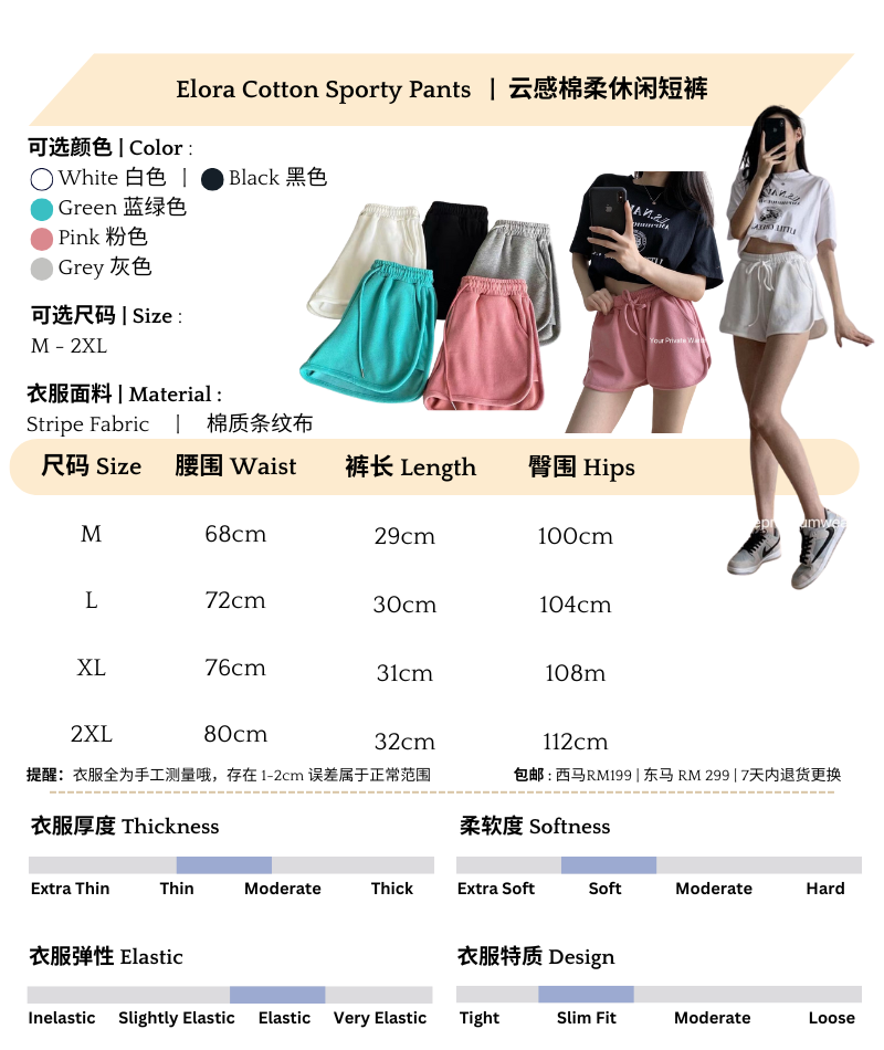 𝘚𝘵𝘢𝘺 𝘤𝘰𝘻𝘺 𝘢𝘯𝘥 𝘴𝘵𝘺𝘭𝘪𝘴𝘩 𝘸𝘪𝘵𝘩 𝘰𝘶𝘳 𝘚𝘰𝘧𝘵 𝘊𝘰𝘵𝘵𝘰𝘯 𝘌𝘭𝘢𝘴𝘵𝘪𝘤 𝘚𝘩𝘰𝘳𝘵𝘴, 𝘥𝘦𝘴𝘪𝘨𝘯𝘦𝘥 𝘧𝘰𝘳 𝘢𝘭𝘭-𝘥𝘢𝘺 𝘤𝘰𝘮𝘧𝘰𝘳𝘵 𝘢𝘯𝘥 𝘦𝘧𝘧𝘰𝘳𝘵𝘭𝘦𝘴𝘴 𝘧𝘢𝘴𝘩𝘪𝘰𝘯. 𝘔𝘢𝘥𝘦 𝘧𝘳𝘰𝘮 𝘱𝘳𝘦𝘮𝘪𝘶𝘮 𝘴𝘰𝘧𝘵 𝘤𝘰𝘵𝘵𝘰𝘯 𝘧𝘢𝘣𝘳𝘪𝘤, 𝘵𝘩𝘦𝘴𝘦 𝘴𝘩𝘰𝘳𝘵𝘴 𝘧𝘦𝘢𝘵𝘶𝘳𝘦 𝘢 𝘴𝘵𝘳𝘦𝘵𝘤𝘩𝘺 𝘦𝘭𝘢𝘴𝘵𝘪𝘤 𝘸𝘢𝘪𝘴𝘵𝘣𝘢𝘯𝘥 𝘢𝘯𝘥 𝘳𝘦𝘭𝘢𝘹𝘦𝘥 𝘧𝘪𝘵—𝘱𝘦𝘳𝘧𝘦𝘤𝘵 𝘧𝘰𝘳 𝘭𝘰𝘶𝘯𝘨𝘪𝘯𝘨, 𝘸𝘰𝘳𝘬𝘰𝘶𝘵𝘴, 𝘰𝘳 𝘤𝘢𝘴𝘶𝘢𝘭 𝘰𝘶𝘵𝘪𝘯𝘨𝘴.