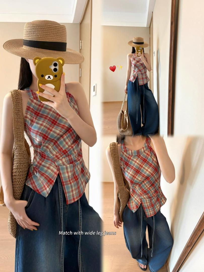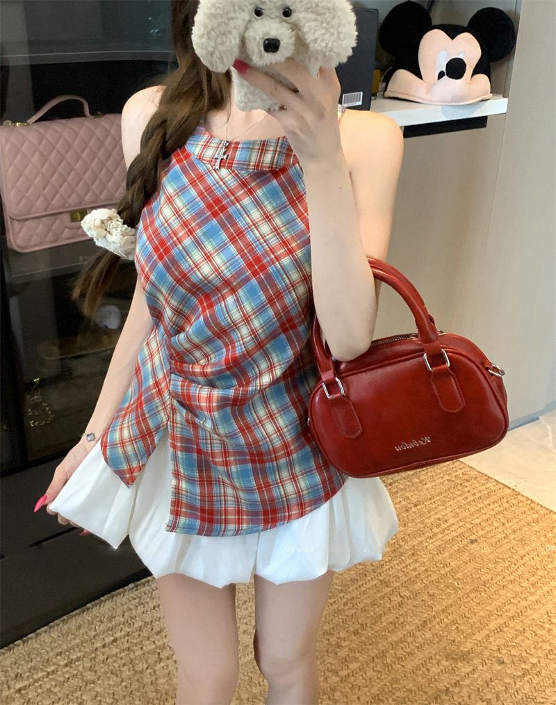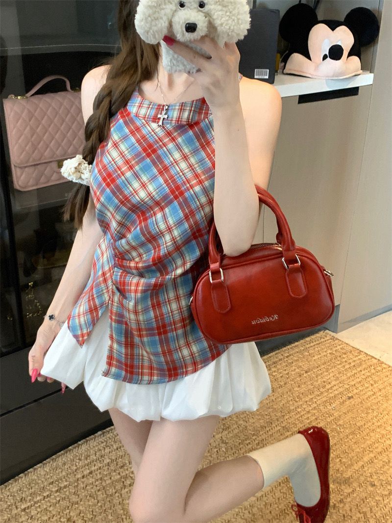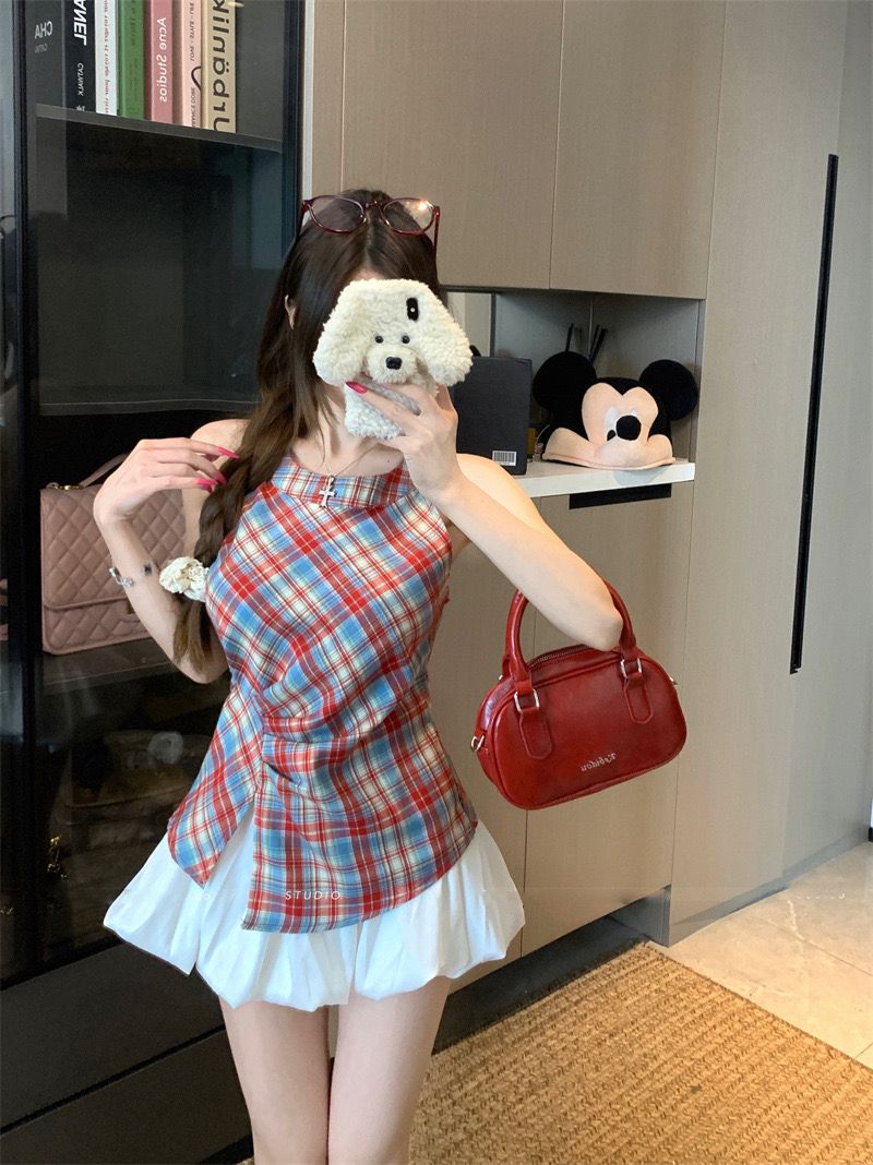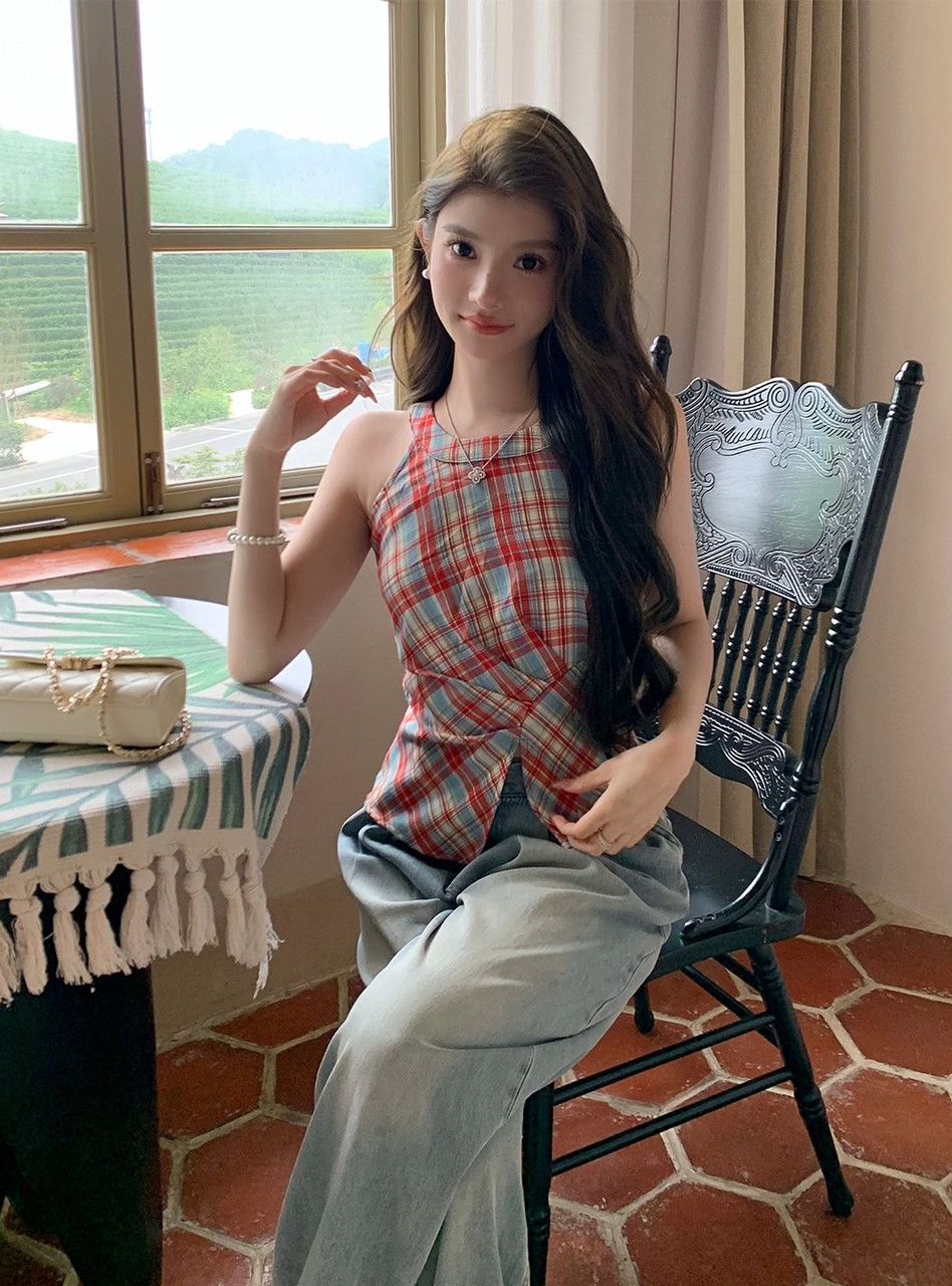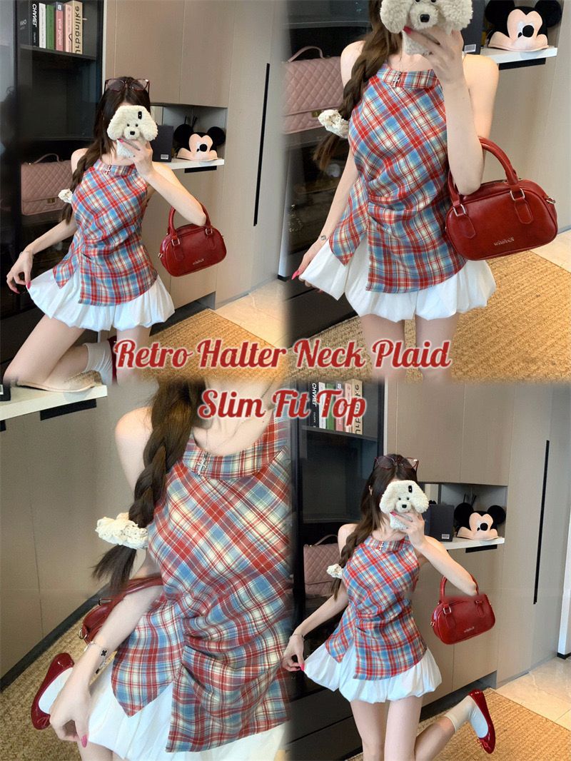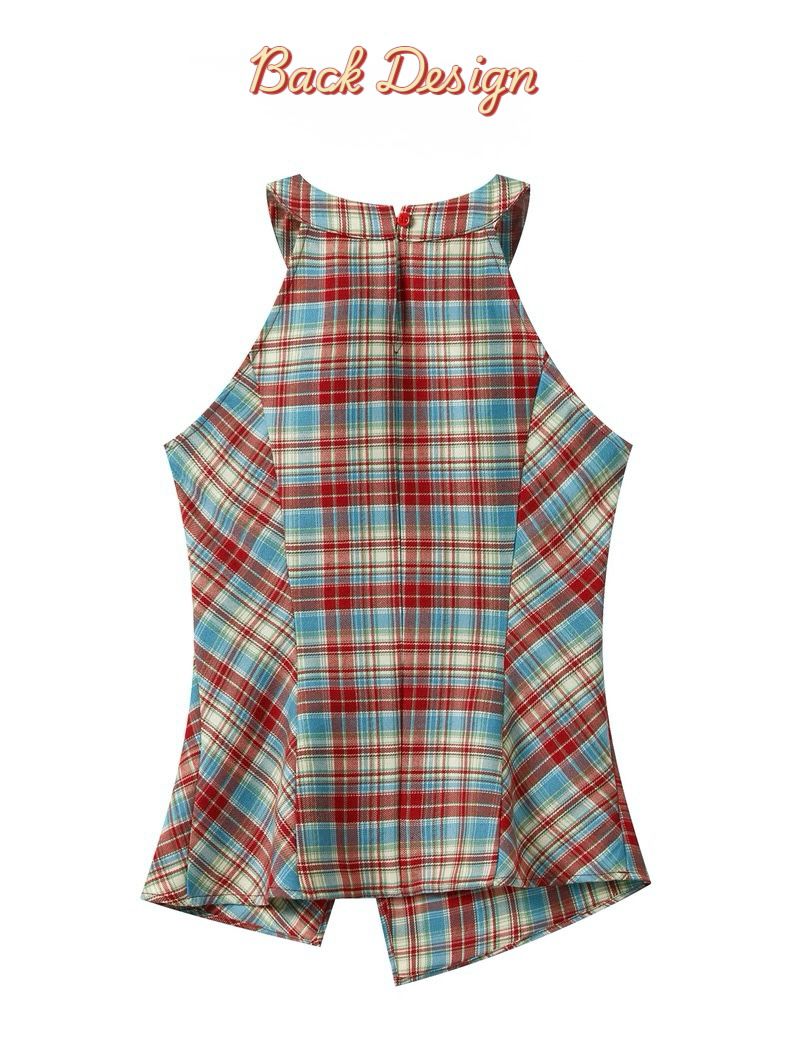 Retro Halter Neck Plaid Slim Fit Top quantity